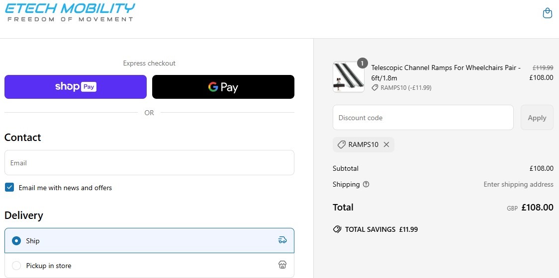 Use E-Tech Mobility UK discount code below to get 10% off the new telescopic ramps.