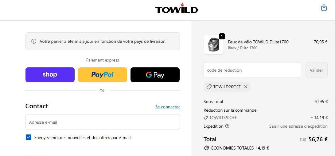 On TowildBikes checkout page, look for the text box called “Promo Code” or “Discount Code.” Once you locate it, paste your TowildBikes promo code into this box. Your discount for TowildBikes will be applied.