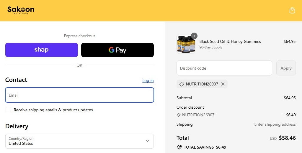 Navigate to Sakoonnutrition.com and place the items you’d like to buy in your shopping cart. When finished shopping, click “Checkout” or “View Cart” to navigate to the Sakoon Nutrition checkout page.