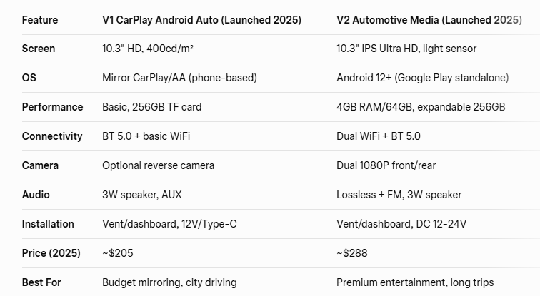 - Performance: V1 relies on your phone, great for basic navigation and calls; V2 runs Android 12+ standalone, downloading Netflix, TikTok directly.
